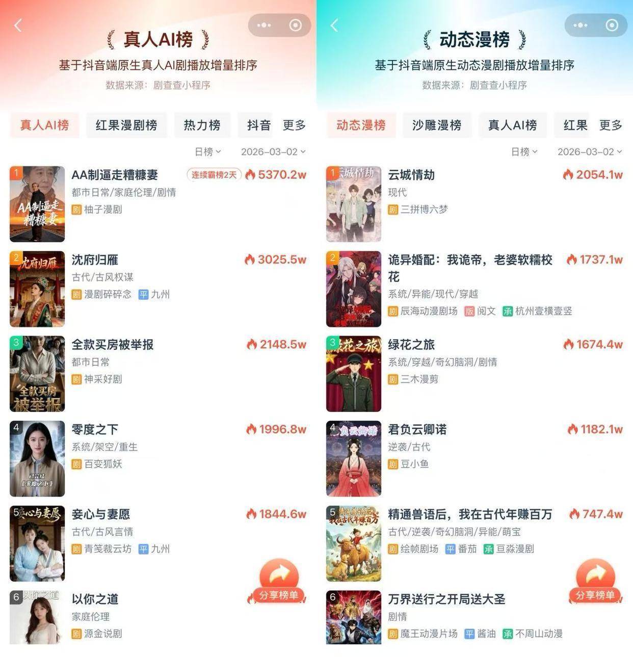 一个最新趋势是,AI真东说念主短剧正在狂飙,成为漫剧爆发的齐备主力。AI真东说念主短剧是由AI生成仿真东说念主格调的作品,DataEye发布的2月漫剧百强榜自满,其中AI仿真东说念主短剧占比近六成。
